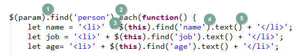 <script type="text/javascript" src="../js/jquery-3.6.0.min.js"></script> <script type="text/javascript"> $(function () { //XML데이터를 읽어 옴 $.ajax({ url:'myXML.jsp', success:function(param){ //데이터를 보내는건 없는상태 $(param).find('person').each(function() { let name = '<li>' + $(this).find('name').text() + '</li>'; let job = '<li>' + $(this).find('job').text() + '</li>'; let age= '<li>' + $(this).find('age').text() + '</li>'; //body태그에 가공한 데이터를 추가 $('body').append('<ul>'+name+job+age+'</ul>'); }); } }); }); </script>