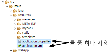 설정파일을 둘 중(.properties/.yml) 하나 선택해서 한다.
